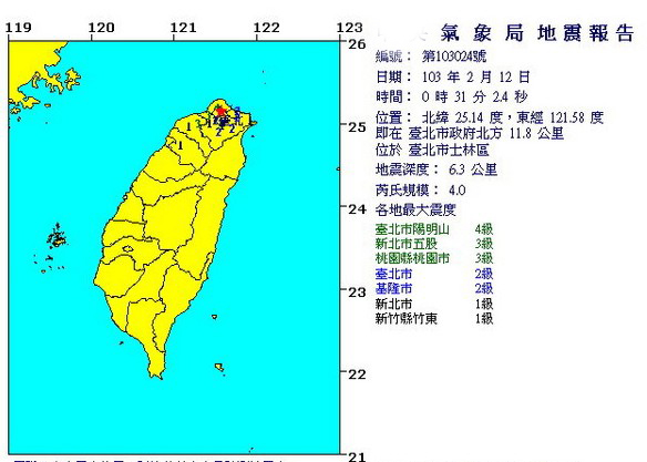 中國臺灣網2月12日消息 據臺灣“東森新聞”報道,12日凌晨零點31分發生的淺層地震,由于震央就在臺北市區內,許多民眾都被嚇醒。有人說晃了將近1分鐘,有人說只聽到“碰”一聲,接著上下搖晃幾秒,還沒開始恐懼就結束。由于震央就在士林區,離大屯火山區的陽明山非常接近,還有人懷疑“難道大屯火山活過來了嗎?”