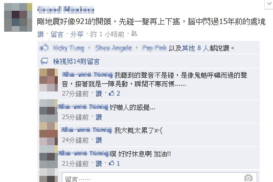 相對于臺北市內的強烈感受,一水之隔的新北市似乎就落差很大。有三峽民眾坐在家中,表示“一點感覺都沒有”,也有剛好遛狗2小時回到家的人貼文與朋友開玩笑說:“就整個人凍僵掉,超級僵,有一種大家都有被震到,我卻沒有的失落感。”