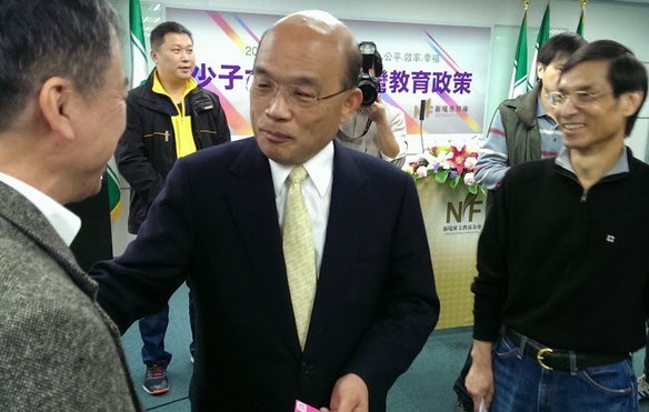 民進(jìn)黨主席蘇貞昌26日出席“少子女化下的教育政策”發(fā)表記者會(huì),和與會(huì)者寒暄。(臺(tái)媒圖)