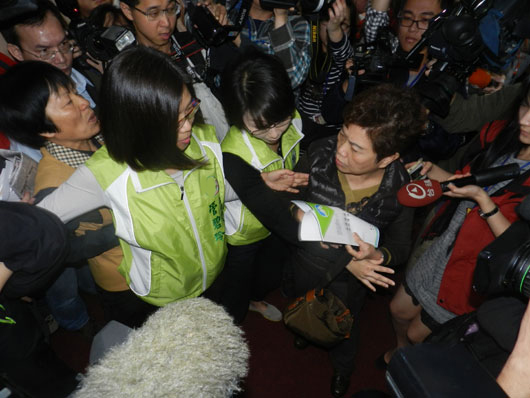 民進(jìn)黨為阻擋審查,昨天下午就搶先進(jìn)入“立法院”群賢樓9樓大禮堂,占據(jù)會議主席臺。今天一早7時30分,約20位“立委”帶著助理在會議室外靜坐,堵住通道,只放行“內(nèi)政委員會”的議事人員。