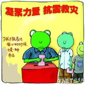 在天涯社區張貼的漫畫里,小鴨子表情嚴肅地對小雞說:“賑災重建,長期任務”;三只小老鼠不停用鐵鍬挖坑蓋房,還拿著大喇叭高喊:“眾志成城,共抗震災”;“蘑菇家族”的醫生則身背降落傘空降災區……