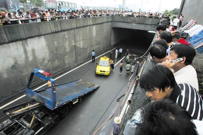 8月5日清晨,司機文輝載著五名乘客闖入重慶寶華路下穿道1.58米深的積水中,致兩人溺水身亡。兩名死者家屬就賠償事宜分別與當事出租車公司達成一致,共獲賠73.5萬元,已收到預付10萬元。調查稱,事故發生的主要原因是出租車駕駛員違規駕駛,事故發生后跑掉,不采取積極的施救措施。