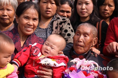 11月2日,江西省宜春市金園街道江峰村老壽星張寶壽喜過110歲壽辰。張寶壽老人生于光緒二十六年(1900年),出身于貧苦農(nóng)民家庭,為人正直,吃苦耐勞,育有三兒三女,如今子孫五代有240余人。據(jù)悉,目前,張寶壽是宜春市年齡最長(zhǎng)的壽星。