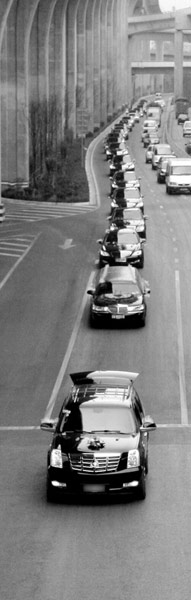 中午12點,這個婚車隊又出現(xiàn)在了穿金路上。一輛凱迪拉克越野車排在車隊最前方,負責(zé)開道和攝像。新郎、新娘乘坐的加長林肯緊隨其后,7輛奔馳S350和1輛奔馳320行駛在車隊靠前方陣,7輛寶馬X5和3輛凱迪拉克位于車隊中間,3輛保時捷卡宴押后。這些車輛除兩輛為重慶牌照、一輛為廣州牌照外,其余車輛均掛著昆明本地車輛號牌。車內(nèi)的人不時搖下車窗,幾乎所有車輛上的司機和乘客都是年輕人,其中不乏剃著光頭的時尚潮人。