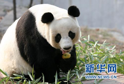 這是大熊貓“泉泉”在濟南動物園吃蘋果的資料照片(2009年11月24日攝)。