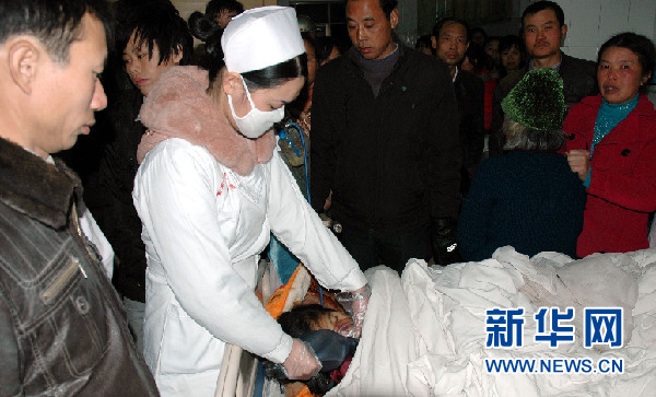 12月27日,醫(yī)護(hù)人員正在搶救受傷的孩子。當(dāng)日早晨,湖南衡南縣松江鎮(zhèn)一輛由東塘村開往因果村的三輪車運(yùn)送20名小學(xué)生,在駛到因果橋時(shí),發(fā)生交通意外,整車墜入河中。截至目前,遇難人數(shù)已上升至14人,其他6名受傷學(xué)生正在醫(yī)院接受救治。新華社記者 韓曦樂 攝