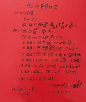 “這又是圖畫,又是數字,又是字母的,難道是傳說中的火星文。”彤彤媽媽將背面的翻譯文打開,這才看懂了意思。隨后,她將這封奇特的信發到了自己的微信朋友圈,引來了好友們的關注和議論。