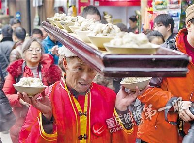 重慶晚報訊 “讓一讓,上菜咯!”昨天中午,67歲的民間藝人陳長發(fā),把堆滿菜碗2米長的托盆頂在頭上,小心翼翼走在江津中山古鎮(zhèn)千米長的石板老街上,挨桌上菜。一聲吆喝,中山古鎮(zhèn)第十一屆“千米長宴”開席了。