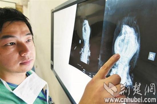 圖為:醫生介紹,手術前歡歡的右手拇指根部被炸斷