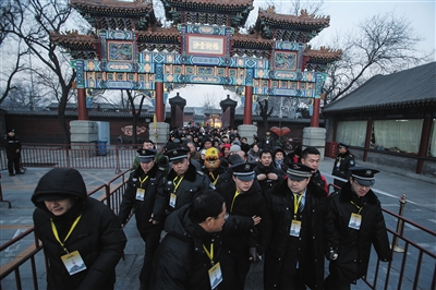 昨日,雍和宮大街,早7時,安保人員手挽手在前排引導香客們從大門走向售票處。當天是大年初一,大批游客與信眾前往雍和宮燒香祈福。本版攝影/新京報記者 彭子洋