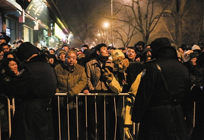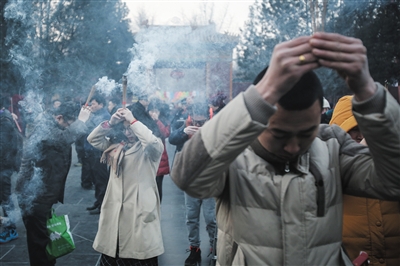 昨日凌晨5時,雍和宮門前已排起百米長隊,寬5米左右的通道擠滿了香客,被圍得水泄不通。不少排隊者穿著羽絨服棉鞋、頭戴棉帽,依然被凌晨的寒氣侵蝕,在原地來回跺腳,反復看著時間。