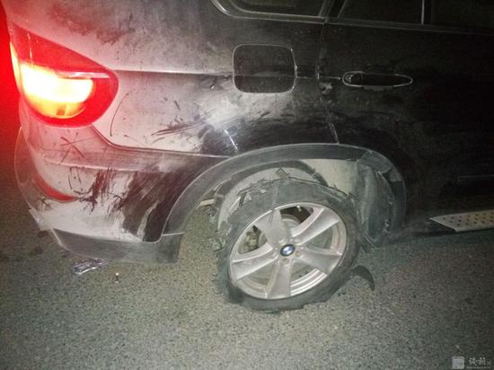 大年初四凌晨零點,浙江高速交警衢州支隊杭金衢高速窯上卡點大隊民警正在崗亭執(zhí)勤,突然聽到江西方向開來一輛轎車發(fā)出疑似坦克聲音。執(zhí)勤民警馬上指 揮車輛靠邊停下。走近一看被眼前看到一幕驚呆了,這輛浙J號牌的寶馬小車右后胎只剩下車轱轆,剛才發(fā)出坦克聲音就是鋁合金鋼圈摩擦地面發(fā)出的。