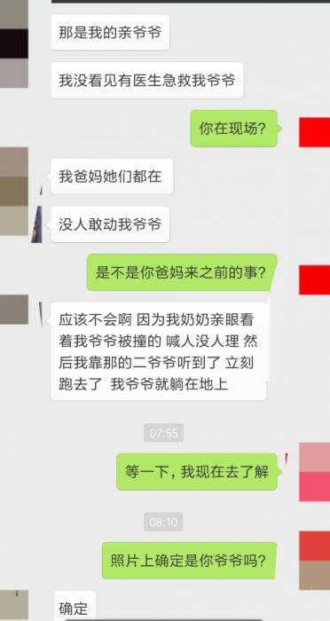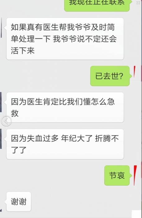 6月22日早上,一名自稱是傷者孫女的女孩與網友聊天的信息公布于眾,女孩稱:她并沒有看到有醫生急救她爺爺,她爸媽都在現場,是沒有敢動爺爺的。并稱,如果真有醫生幫及時簡單處理一下,爺爺說不定會活下來。