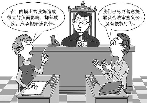 一名年近花甲的老太,應(yīng)一家文化傳播公司邀請上電視講述家庭糾葛,節(jié)目播出后遭到他人非議,承受巨大壓力,后以剪輯后的節(jié)目內(nèi)容與錄制過程要反映的問題有較大出入,節(jié)目的播出給其造成很大的負面影響,致其抑郁成疾等為由,將文化傳播公司告上了法庭,索賠200余萬元。文化傳播公司認為,在節(jié)目攝制中已盡到善意提醒及合法審查義務(wù),對受訪者沒有侵權(quán)行為,不應(yīng)承擔賠償責(zé)任。那么,上電視自揭“家丑”、不堪壓力抑郁成疾,這個責(zé)任該誰負?