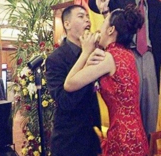 徐帆和馮小剛在婚宴上被陳凱歌、葛優等大腕不停勸酒。葛優還擔起招呼客人和“惡整”新人的重任。他拿出香蕉讓新人一邊咬一頭,能吃多少吃多少,但是必須一塊兒咬,羞得徐帆最后差點求饒:“你們這都太狠了。”