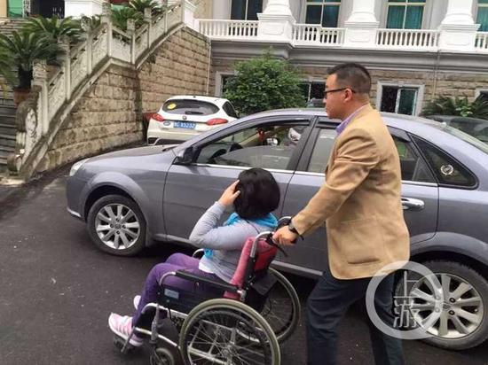 吳焱推著朵朵到紅花崗區(qū)人民法院參加庭審。(受訪者供圖)