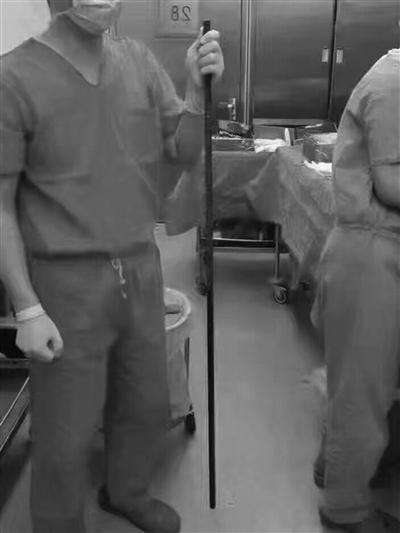 手術過程中,胸外科醫生首先開胸,將鋼筋穿過的左肺實施切除手術,隨后,將鋼筋從胸腔推至腹腔,修補膈肌。完成后普外科醫生打開患者腹部,探查鋼筋經過的地方后發現胃部有損傷,隨即實施了胃部分切除,再次反復確認沒有其他臟器受傷的情況下,醫生開始從其下體緩緩將鋼筋抽出,并反復灌入雙氧水、生理鹽水進行沖洗,預防感染的發生。整個手術過程中,按照既定計劃,各科室醫生排隊待命,這一科室的醫生手術,下一科室的醫生候場,在院方胸外科、泌尿外科、普外科、麻醉科等多科協作下,這根1.4米長的鋼筋被完整取出。這場有驚無險的手術前后進行了6個半小時,一直持續到深夜。