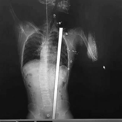 “看到CT報告,我們發現鋼筋直達肩胛”。徐進宇說,從報告上看,鋼筋是從肛門旁進入,穿過腹部和胸部,所幸是從脾、胃、腎中間穿過,和心臟擦過,而且沒有傷及大血管。徐主任說,小楊非常幸運,這根鋼筋的走線都沒有觸碰到關鍵要害,如果傷到了致命血管,勢必造成大出血,病人往往都等不及送醫。
