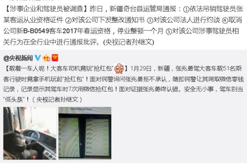 1月29日,新疆,張兆勇駕大客車載51名乘客行駛時竟拿手機玩起“搶紅包”!面對民警詢問張兆勇拒不承認,隨即民警讓其調(diào)取微信零錢記錄,記錄顯示其駕車時7次用微信搶紅包!面對證據(jù)張兆勇終認錯。