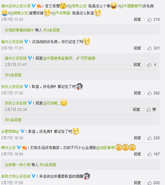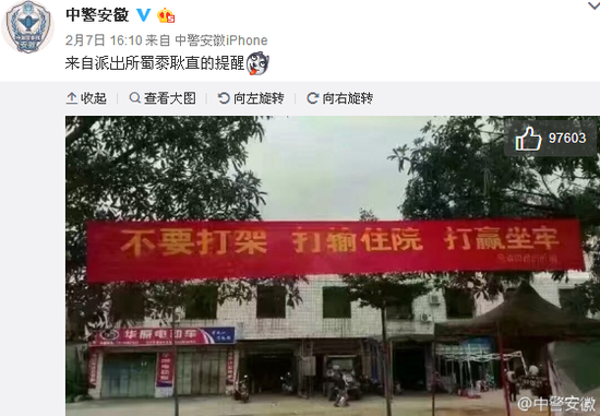 2月7日,@中警安徽貼出一張勸解別打架的標語,走紅網絡。此標語一出,立即引來各地警方官微的轉發以及網友的熱評。
