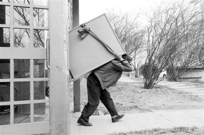 3月19日,庹師傅從北京五環(huán)外一棟居民樓里把衣柜背出來,長條綁帶包著衣柜更容易著力,但衣柜還是把他的腰壓得深彎下去。本報記者 吳凡 攝