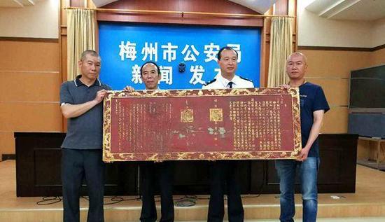 3月21日,梅州市公安局收到梅江區三角鎮大壢村蘭軒公祠葉氏宗族人員和海外鄉親聯名來信,反映清代圣旨匾額被盜情況。據葉氏宗親介紹,其先祖葉舒華在約150年前的清代任朝庭官員,因政績非凡受朝庭褒揚,先后獲授咸豐、同治皇帝圣旨匾額共3塊,另有3副共6塊的對聯豎匾、1塊清末翰林游顯廷題寫“退一步想”的橫匾。上述匾額的市場估值近百萬元,一直交由族中人員葉某勝代為保管,發現被盜后向公安機關報案。