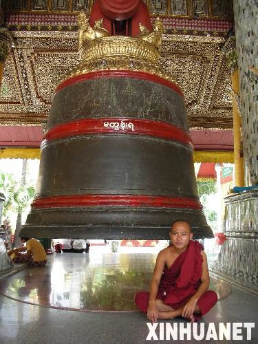 10月20日,僧侶坐在緬甸著名的仰光大金塔內的大鐘前。 緬甸警方證實,緬甸已經取消仰光和曼德勒兩市自9月25日開始實行的宵禁。 新華社記者 張云飛 攝