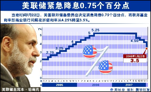 當(dāng)天紐約股市開盤前,美聯(lián)儲宣布緊急降息0.75個百分點,將聯(lián)邦基金利率從4.25%降至3.50%。不過,由于全球股市大幅走低,而當(dāng)天紐約股市休市,紐約股市22日開盤后呈現(xiàn)補(bǔ)跌行情,道瓊斯30種工業(yè)股票平均價格指數(shù)一度下跌近465點。此后,在美聯(lián)儲大幅降息的鼓舞下,市場逐漸回穩(wěn)。