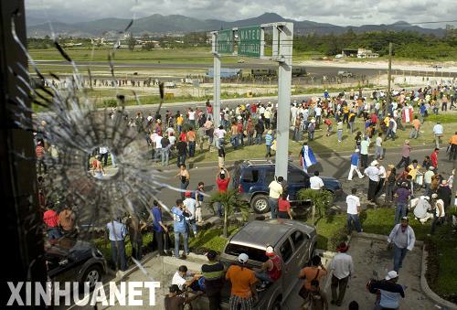 7月5日,洪都拉斯被罷免總統塞拉亞的支持者聚集在首都特古西加爾巴國際機場。當日,被罷免總統塞拉亞的支持者與軍警在這里發生激烈沖突,目前至少造成2人死亡,多人受傷。當天,洪都拉斯被罷免總統塞拉亞乘專機從華盛頓飛往洪首都特古西加爾巴。洪臨時政府軍隊在跑道上設置障礙阻止專機降落。新華社發(戴維攝)