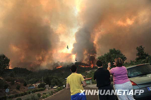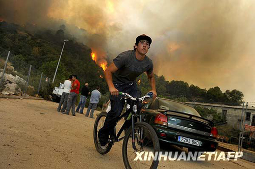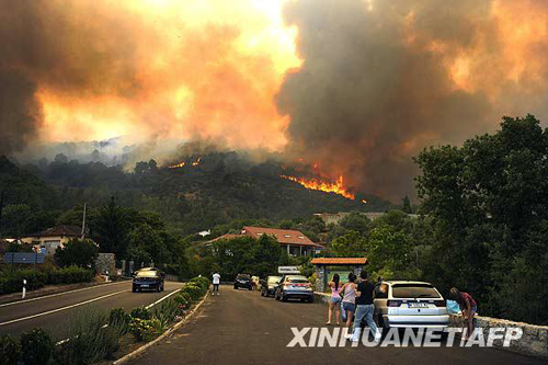7月28日,在西班牙中部城市阿維拉附近,人們在遠處觀望森林大火。當日,西班牙部分地區氣溫高達40攝氏度,西班牙內政部向該國四分之三地區發布了最高級別森林火險預警。新華社/法新