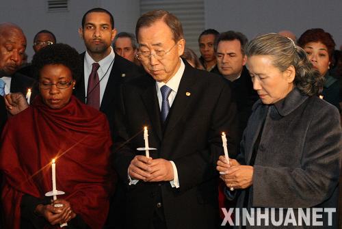 1月19日,在紐約聯(lián)合國總部,聯(lián)合國秘書長潘基文(前中)手持蠟燭參加為海地地震遇難者舉行的燭光悼念活動(dòng)。當(dāng)日,聯(lián)合國總部舉行花圈敬獻(xiàn)儀式和燭光悼念活動(dòng),向在海地地震中遇難的聯(lián)合國工作人員及所有的地震遇難者表示哀悼。新華社發(fā)