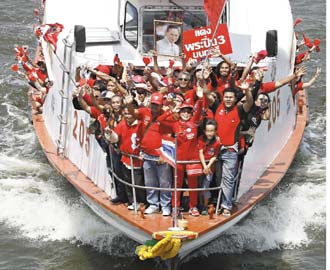 數(shù)萬(wàn)名泰國(guó)紅衫軍14日自泰國(guó)各地涌向首都曼谷,試圖迫使泰國(guó)總理阿披實(shí)解散國(guó)會(huì)并下臺(tái)。圖為部分紅衫軍當(dāng)天乘船前往曼谷的情景。