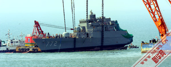 4月24日,在韓國白翎島附近水域,工作人員在打撈“天安”號警戒艦艦首。新華社/紐西斯通訊社