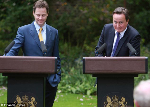 報(bào)道稱,首相卡梅倫和副首相克萊格肩并肩的站在光影斑駁的唐寧街花園。他們共同分享幽默,數(shù)次含義頗深的眼神交流讓所有人都認(rèn)為他們并不是要刻意制造歡樂的氣氛。
