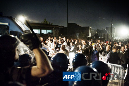 那不勒斯警察在該城特茲格諾區的一個垃圾場附近與示威群眾對峙。(AFP/國際在線)