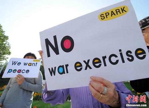 韓美反潛聯(lián)合軍事演習(xí)2010年9月27日在韓國西部海域(黃海)拉開帷幕。當(dāng)日,一些韓國反戰(zhàn)人士在國防部門前集會(huì)抗議美韓聯(lián)合軍演。