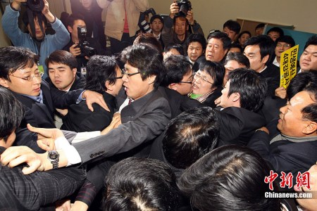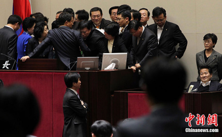 在韓國議會,這類激烈沖突已經屢見不鮮。遇到自己強烈反對的議案或者提議時,議員們通常會用“武力”表達自己的不滿。嚴重時,議員利用桌椅、滅火器群毆,甚至有人被打掉牙。