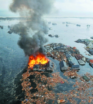 昨日,日本仙臺(tái),經(jīng)歷了地震和海嘯襲擊后,被淹沒的房屋起火。