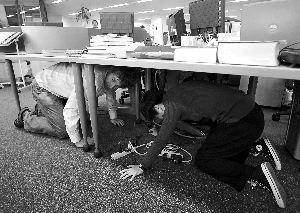 11日,日本東京,美聯(lián)社東京局的記者們?cè)诘卣饡r(shí)躲到桌下。