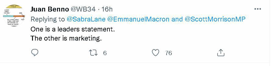 而在涉及氣候變化的部分,法方的說法也同樣讓莫里森頗為難堪,因為從措辭來看,法方似乎是覺得澳大利亞在應對氣候變化問題上不應該光有承諾,還應該付諸于行動,并尤其提到了澳方應該致力于減少煤炭的生產和使用。