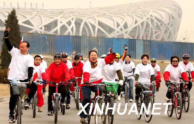 3月1日,自行車(chē)愛(ài)好者到達(dá)國(guó)家體育場(chǎng)“鳥(niǎo)巢”。當(dāng)日,來(lái)自北京市各區(qū)縣的500多名自行車(chē)愛(ài)好者在北京市自行車(chē)運(yùn)動(dòng)協(xié)會(huì)的組織下,從先農(nóng)壇體育場(chǎng)出發(fā),參加“綠色騎行”活動(dòng)。新華社發(fā)(李慧 攝)