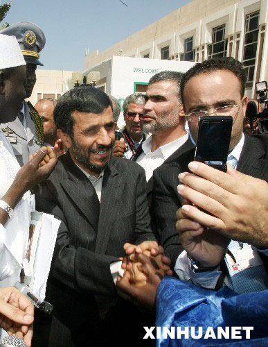 3月13日,在塞內(nèi)加爾首都達喀爾舉行的第11次伊斯蘭國家首腦會議開幕式上,伊朗總統(tǒng)艾哈邁迪-內(nèi)賈德(中)與支持者握手。 新華社記者王迎攝