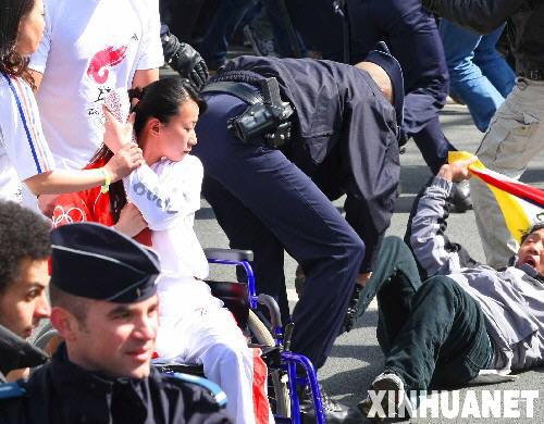 4月7日,北京奧運圣火在巴黎傳遞時遭遇少數(shù)“藏獨”分子的干擾破壞。這是巴黎警察及時制止一名擾亂火炬?zhèn)鬟f者試圖從火炬手手中搶奪火炬。 新華社記者戚恒攝
