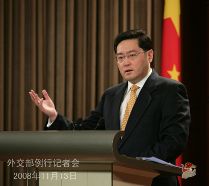 2008年11月13日,外交部發言人秦剛舉行例行記者會,就胡錦濤主席出席20國集團領導人金融市場和世界經濟峰會、六方會談等答問。