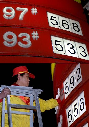 國家發展改革委24日宣布,鑒于近期國際市場原油價格持續上升,根據完善后的成品油價格形成機制,決定自3月25日零時起將汽、柴油價格每噸分別提高290元和180元。調整后97號汽油每升為5.92元,上漲0.24元;93號汽油每升5.56元,上漲0.23元。這是調整前的97號、93號汽油價格(上)和調整后的價格(下)。新華社記者公磊攝
