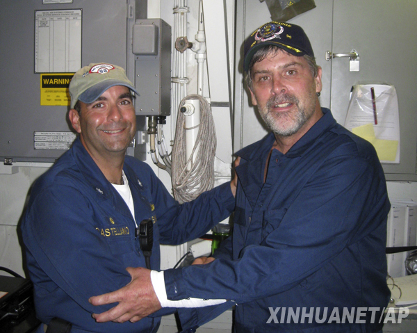 這張4月12日美國海軍發布的照片顯示的是被索馬里海盜劫持的美國船長理查德?菲利普斯(右)在獲釋后與美國海軍船艦的一名指揮官合影。美國媒體12日報道,8日被索馬里海盜劫持在一艘救生艇上作為人質的美籍丹麥貨船船長理查德?菲利普斯已經獲釋。 新華社/美聯