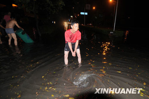 6月7日晚上,市民在柳州市西環(huán)路疏通下水道。 6月7日晚,廣西柳州市遭遇暴雨天氣,當?shù)貧庀蟛块T于22時49分發(fā)布暴雨橙色預(yù)警信號。暴雨造成一些路段積水,給市民帶來不便。新華社發(fā)