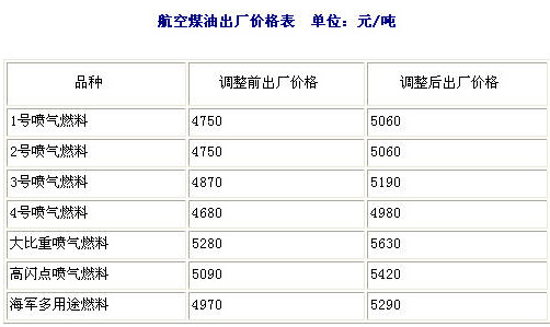 航空煤油出廠價格表 單位:元/噸(注:3號噴氣燃料航空煤油出廠價每噸由4870元上調(diào)至5190元,每噸上調(diào)320元)資料來源:新華網(wǎng)