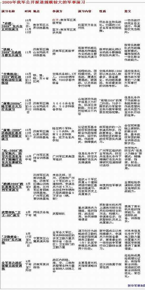 據(jù)新華軍事的不完全統(tǒng)計,截至2009年11月30日,今年以來經(jīng)權(quán)威媒體公開報道的較大規(guī)模的中國軍隊參與的軍事和非軍事演習(xí)(練)就有18次。其中如"跨越2009"跨區(qū)基地實兵系列軍事演習(xí)更是受到了媒體的重點關(guān)注,曝光率極高。媒體報道的內(nèi)容很非常的寬泛,從行軍過程,到士兵裝具的變化,再到演習(xí)過程的記者目擊,讀者通過這些報道可以了解到演習(xí)的很多細節(jié)。