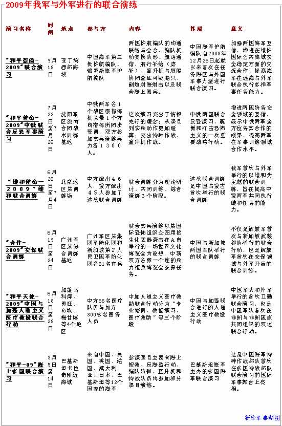 此外,今年中國軍隊還參與了6次中外聯(lián)合軍事演練(習(xí))。其中有多個"首次"--中國特種部隊首次亮相國際軍演舞臺,中國軍隊首次與外軍進行衛(wèi)勤聯(lián)合演練,解放軍首次與外軍進行安保領(lǐng)域聯(lián)合訓(xùn)練,我軍與外軍的首次維和聯(lián)合訓(xùn)練。聯(lián)合演習(xí)中的重頭戲是,"和平使命-2009"中俄聯(lián)合反恐軍事演習(xí)。